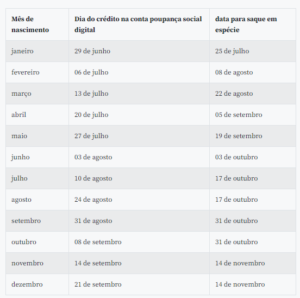 O dinheiro só será liberado para saque ou transferência para outra conta bancária a partir de 17 de outubro, para os trabalhadores nascidos em julho. O calendário de crédito na conta poupança digital e de saques foi estabelecido com base no mês de nascimento do trabalhador.