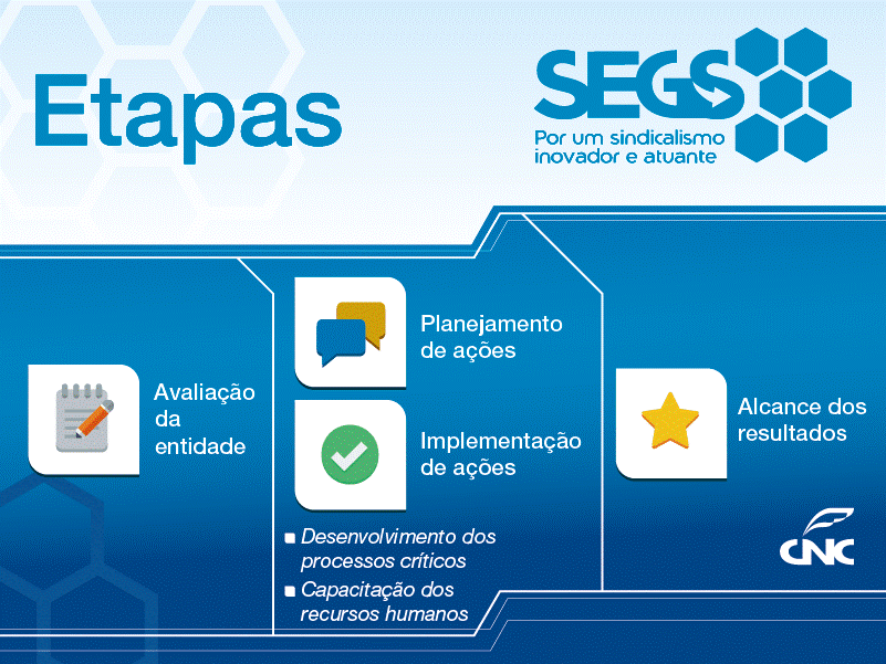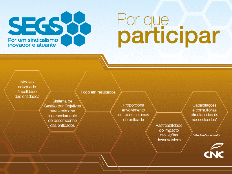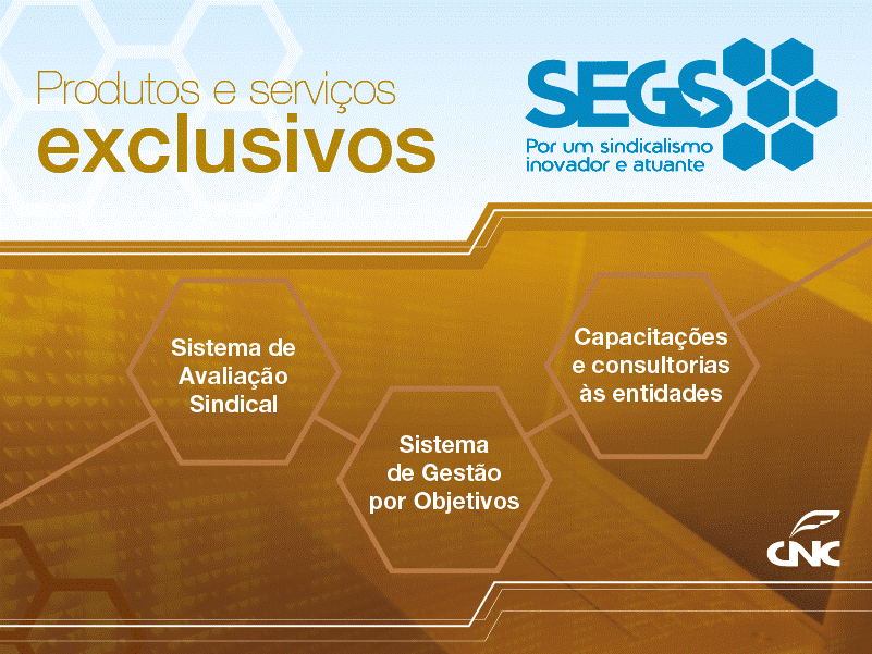 As entidades participantes do Sistema de Excelência em Gestão Sindical (SEGS) têm acesso a sistemas exclusivos, desenvolvidos pela CNC, o Sistema de Avaliação Sindical (SAS) e o Sistema de Gestão por Objetivos (SGO), visando aperfeiçoar o gerenciamento da atuação das entidades sindicais. Além disso, poderão obter capacitações e consultorias conforme necessidades e demandas identificadas na avaliação, além do networking com entidades de todo o Sistema Comércio.
