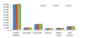 Somente Campo Grande, Corumbá, Dourados, Naviraí, Ponta Porã e Três Lagoas somam 75,31% do total de MEIs do Estado. E mesmo considerado o acumulado até fevereiro de 2019, em relação aos dados consolidados de 2018 e 2017, houve crescimento da quantidade de estabelecimentos. Admitindo-se apenas o acumulado de 2017, 2018 e 2019 dos meses de janeiro e fevereiro, o comportamento também é de queda em janeiro na comparação a dezembro, nesses municípios.