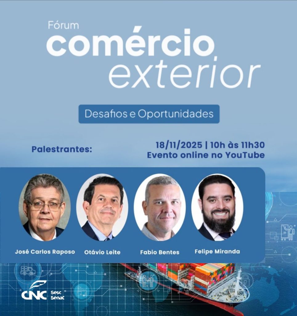A Confederação Nacional do Comércio de Bens, Serviços e Turismo (CNC) realiza, no próximo dia 18 de novembro, das 9h às 10h30 (horário de Mato Grosso do Sul) o evento online “Fórum Comércio Exterior – Desafios e Oportunidades”, que será transmitido ao vivo pelo canal da CNC no YouTube. Voltado a empresários, gestores e profissionais […]
