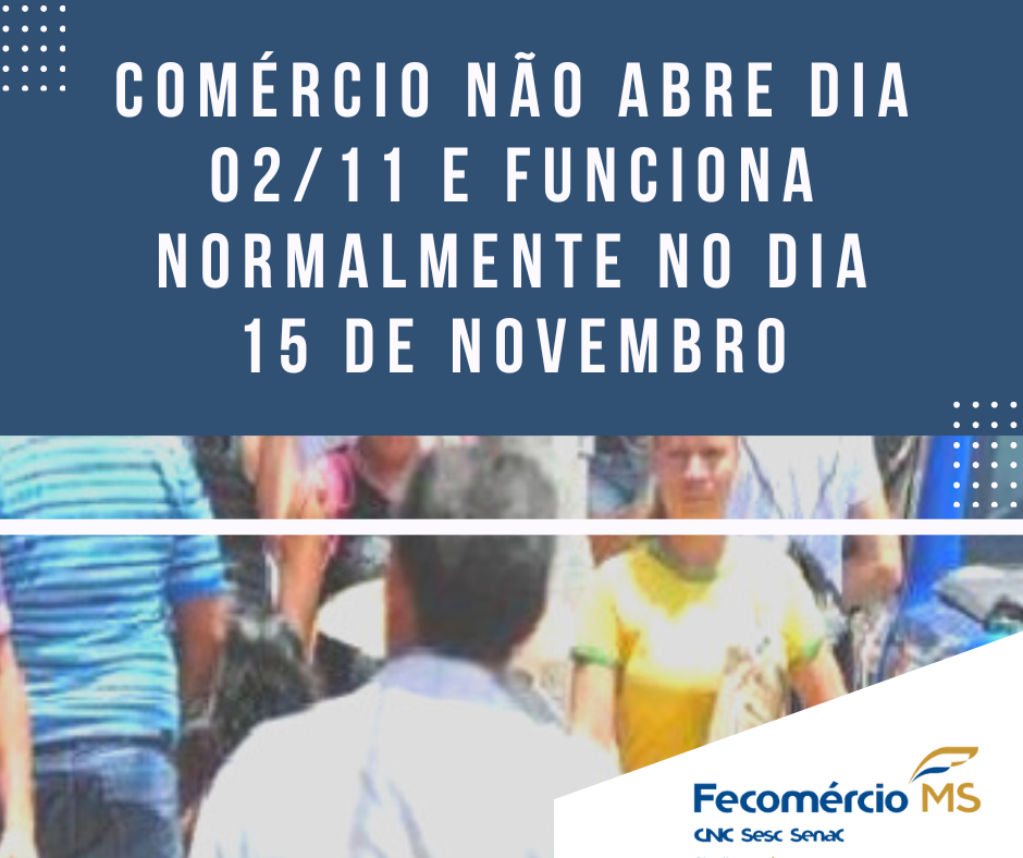 O comércio de Campo Grande não abrirá as portas no feriado do Dia de Finados, próxima quarta-feira (02/11), conforme lei municipal complementar nº 81/2006. Já no dia 15 de novembro, feriado nacional de Proclamação da República, os estabelecimentos podem abrir as portas mediante o cumprimento de algumas normas, conforme estabelecido em Convenção Coletiva de Trabalho, firmada entre […]
