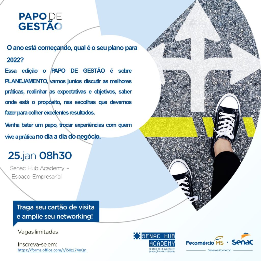 Será no próximo dia 25 de janeiro (terça-feira), a primeira edição do ano do “Papo de Gestão”, realizado pelo Senac Hub Academy, em Campo Grande, que falará sobre “Planejamento”. O evento será realizado a partir das 8h30 no espaço empresarial e é uma oportunidade de discutir as melhores práticas, realinhar objetivos e expectativas para a […]