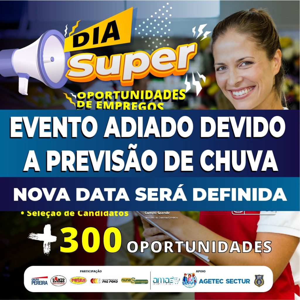 Está cancelado o evento “Dia Super” que seria realizado nesta sexta-feira. Segundo os organizadores, o motivo é o alerta de chuvas intensas para Campo Grande previstas pelo INMET – Instituto Nacional de Meteorologia. Segundo o Sindsuper MS (Sindicato do Comércio Varejista de Gêneros Alimentícios), um dos organizadores, nova data será anunciada. Além do Sindicato, outros […]