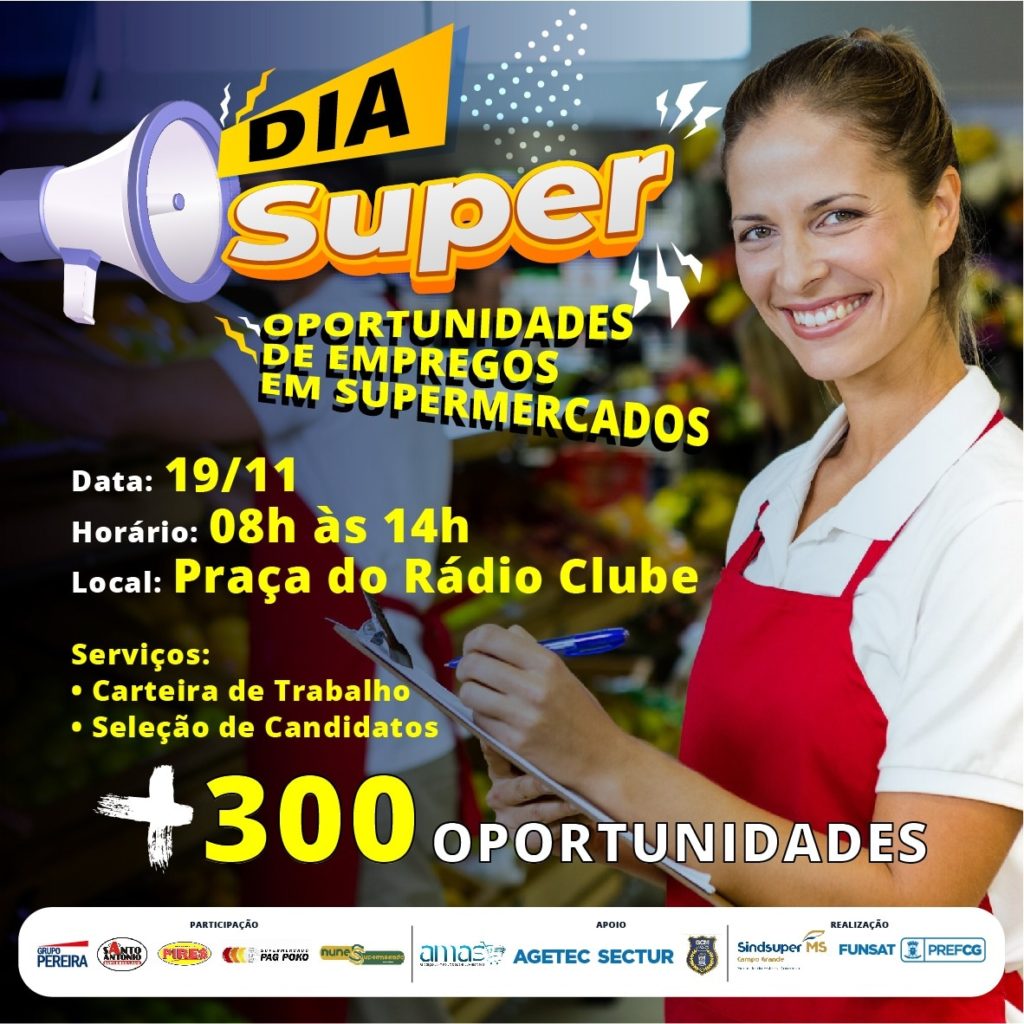 Iniciativa é realizada em parceria com Funsat e Prefeitura Municipal de CG Quem estiver atrás de uma oportunidade de emprego e interessado em trabalhar no setor supermercadista, tem uma oportunidade extra. Na próxima sexta-feira, 19 de novembro, das 8 h às 14h, o Sindsuper MS (Sindicato do Comércio Varejista de Gêneros Alimentícios), a Funsat (Fundação […]