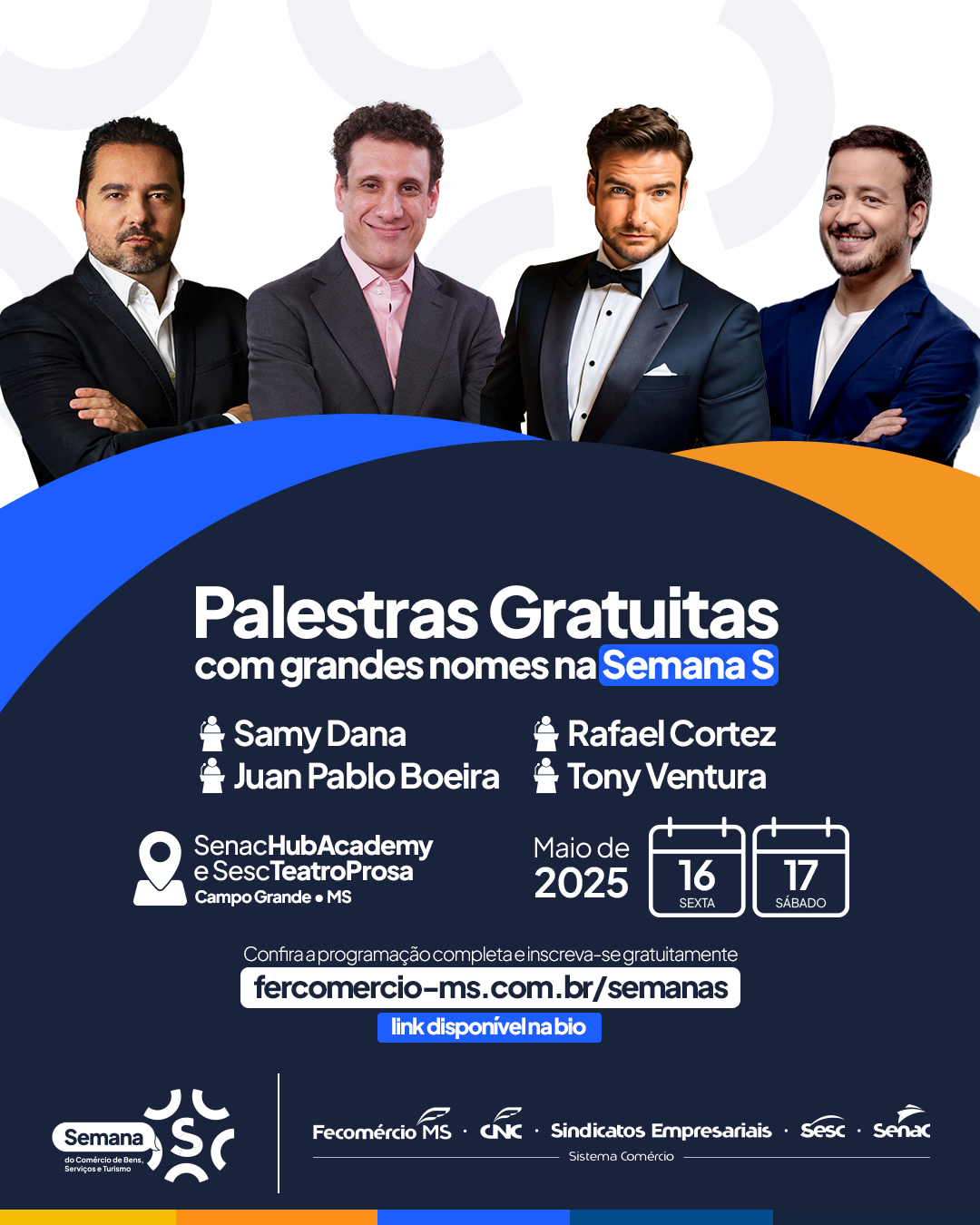 Nos dias 16 e 17 de maio, os sindicatos que compõem o Sistema Comércio MS – formado pela Fecomércio-MS, Sesc, Senac, IPF-MS e sindicatos empresariais filiados – promovem uma série de ações durante a Semana S, iniciativa coordenada nacionalmente pela Confederação Nacional do Comércio de Bens, Serviços e Turismo (CNC). A proposta visa ampliar a cultura […]