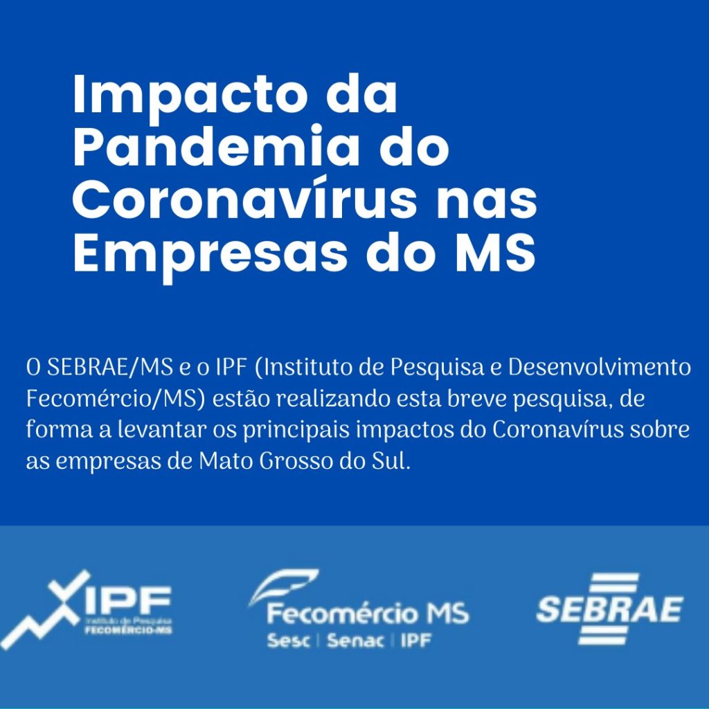 O Sebrae MS e o IPF (Instituto de Pesquisa e Desenvolvimento Fecomércio/MS) lançam nesta quarta-feira, 15/4, uma pesquisa para subsidiar informações sobre os principais impactos do Coronavírus sobre as empresas do Estado. Segundo os organizadores, a participação nesta pesquisa é muito importante, para que se possa contribuir com estratégias que amenizem esses impactos e as […]