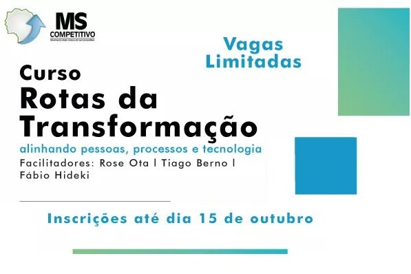Nos dias 21, 22, 23, 24 e 25 de outubro o MS Competitivo realizará o Curso “Rotas da Transformação – alinhando pessoas, processos e tecnologia”. As aulas serão das 18h às 22h no Sebrae MS e as inscrições devem ser feitas até o dia 15 de outubro pelo e-mail pqgmscompetitivo@gmail.com. O curso terá como facilitadores Rose […]