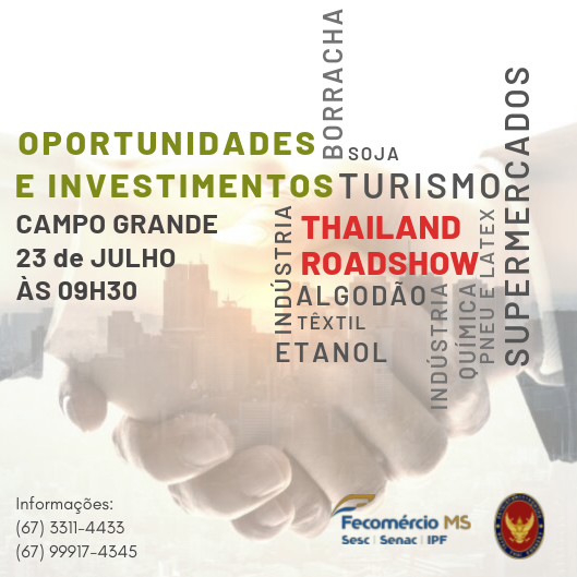 No dia 23 de julho, terça-feira, às 09h30, a Fecomércio-MS promove o seminário “Thailand Roadshow – Oportunidades de Negócios e Investimentos”, com a presença do embaixador da Tailândia no Brasil Susarak Suparat. Oportunidade para estreitar as relações do comércio e também do turismo do Brasil com o País asiático. O evento será no Senac Turismo […]