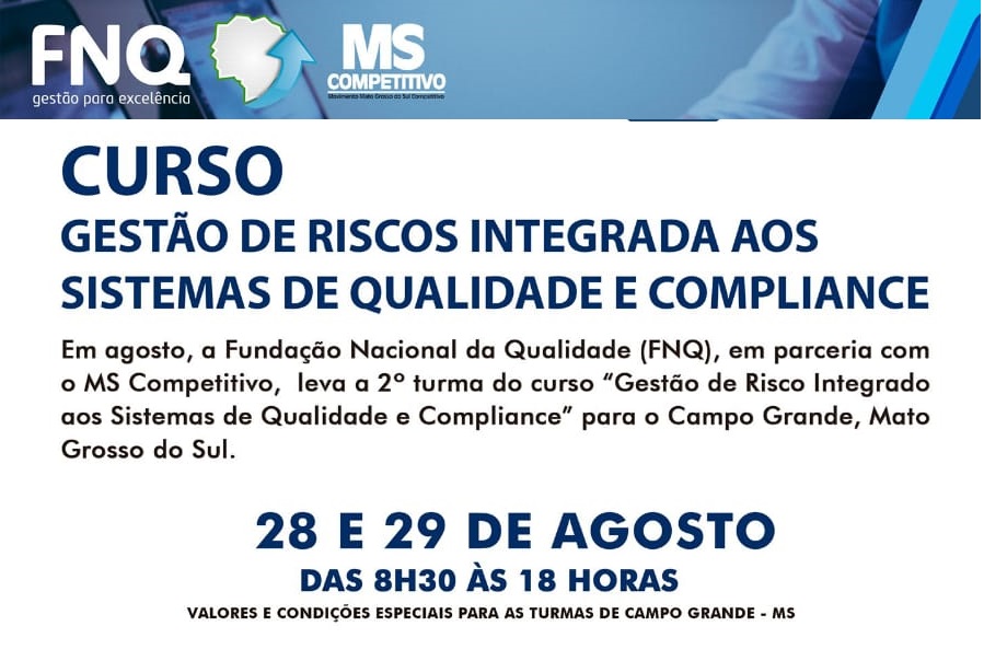 O MS Competitivo promove a segunda turma do curso “Gestão de riscos integrada aos sistemas de qualidade e compliance”, nos dias 28 e 29 de agosto e, com a nova data, as inscrições seguem abertas até o dia 15 de agosto. O treinamento acontece na Faculdade Novoeste, em Campo Grande, ministrado pelo especialista em Gestão de Riscos Marco Nutini. , O curso é uma parceria com a Fundação […]