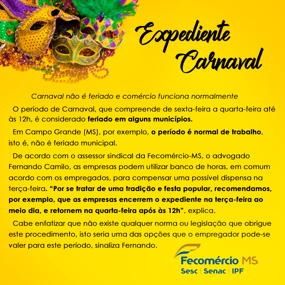O período de Carnaval, que compreende de sexta-feira a quarta-feira até às 12h, é considerado feriado em alguns municípios. Em Campo Grande (MS), por exemplo, o período é normal de trabalho, isto é, não é feriado municipal. De acordo com o assessor sindical da Fecomércio-MS, o advogado Fernando Camilo, as empresas podem utilizar banco de horas, […]