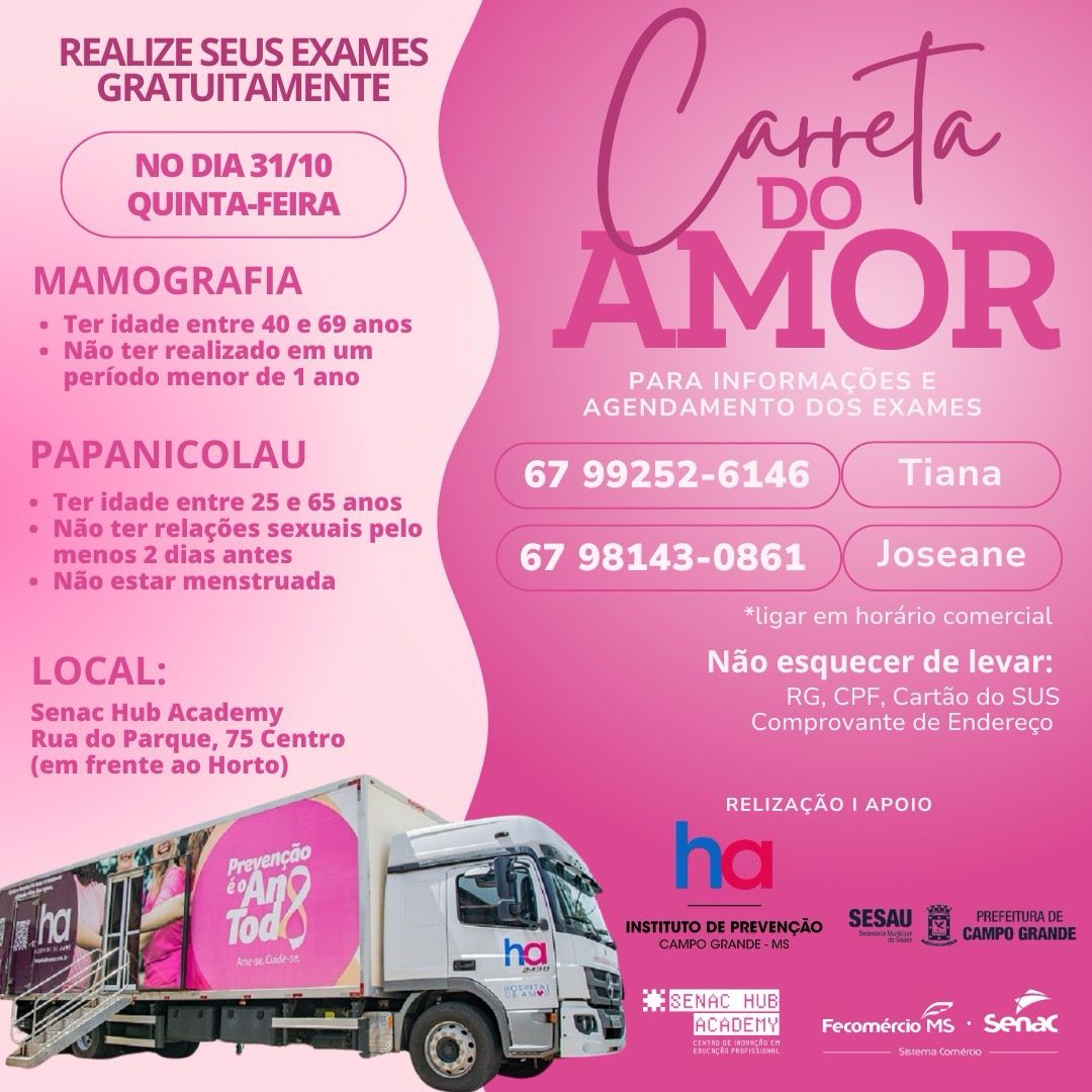 No dia 31 de outubro, a Carreta do Hospital de Amor estará disponível no Senac Hub Academy, instituição que integra o Sistema Fecomércio MS, para realizar exames gratuitos de mamografia e preventivo. A carreta ficará estacionada na frente da escola, na Rua do Parque, 75, em frente ao Horto Florestal, em Campo Grande. Para o […]