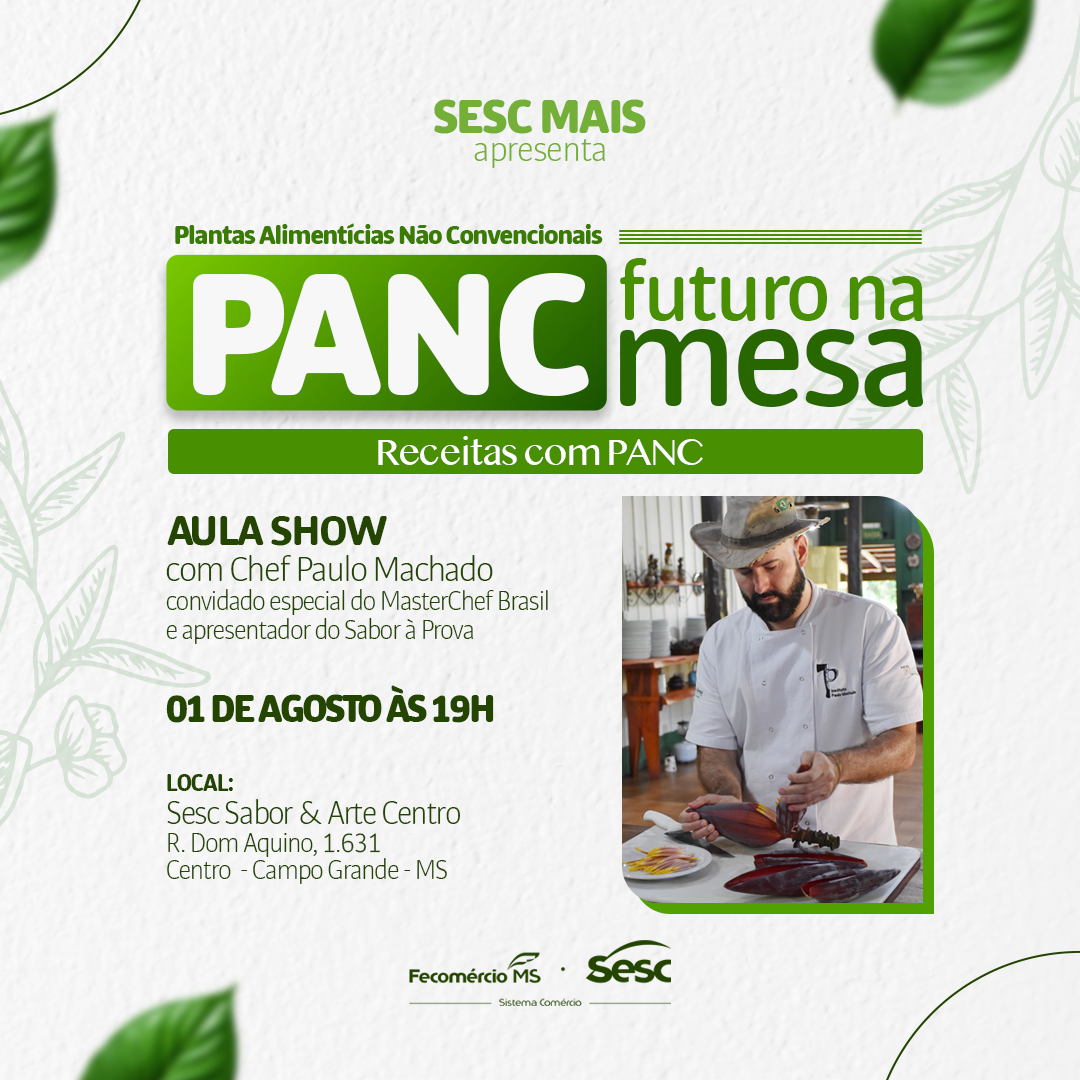 No dia 01 de agosto, quinta-feira, às 19 horas, o Sesc MS, por meio do Sesc Mais, realiza uma aula-show do Projeto “PANC – Futuro na Mesa”, com o chef Paulo Machado, com intuito de estimular um debate voltado a inserção de Plantas Alimentícias Não Convencionais (PANC) na alimentação diária das pessoas. O evento será no Sesc Sabor & Arte Centro, na […]