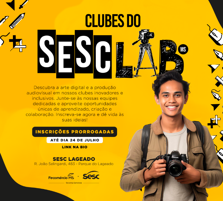Termina nesta quarta-feira, 24, as inscrições para os Clubes do Sec Lab MS, laboratório de criatividade, na unidade Sesc Lageado. Este projeto visa proporcionar aos jovens da comunidade um espaço de aprendizado, desenvolvimento técnico e criativo nas áreas de Arte Digital, Vídeo e Áudio. As inscrições foram prorrogadas até o dia 24 de julho, e […]