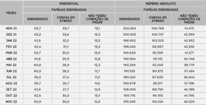 De acordo com a pesquisa, o índice de famílias com contas parceladas, como cheques pré-datados, cartões de crédito, carnês de lojas, empréstimo pessoal, prestações de carro e seguros, ficou em 60,9% em novembro ante 62,4% em outubro. Em novembro de 2021, esse índice era de 63,7%.