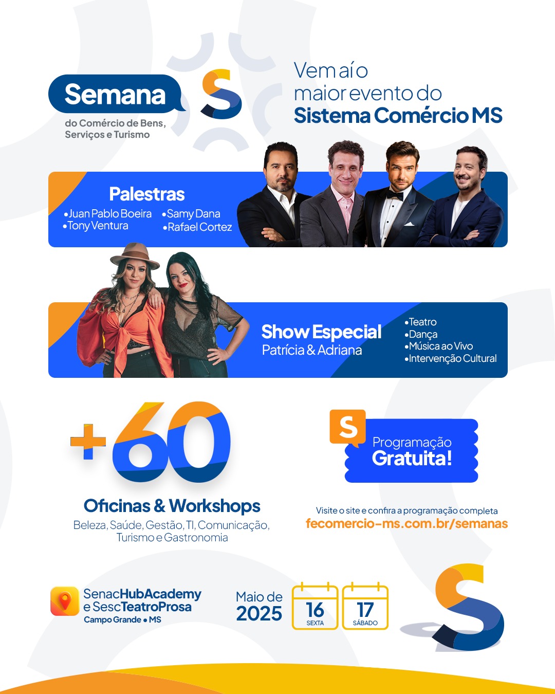 A capital sul-mato-grossense recebe nos dias 16 e 17 de maio a Semana S do Comércio, com uma programação especial voltada aos trabalhadores do comércio, empresários e toda a comunidade. As atividades acontecem no Senac Hub Academy e no Sesc Teatro Prosa, com atrações culturais, oficinas práticas e palestras com nomes de destaque nacional.